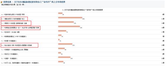 經(jīng)過24小時的線上匿名投票,財(cái)務(wù)管理部張?zhí)m 、光谷環(huán)保合同能源部張琪、科技園招商策劃部任謙、科技園設(shè)計(jì)管理部歐陽威4名投票排名最高的同事獲得200元、100元及50元(兩名)新華書店讀書券的獎勵。獲獎?wù)呖梢栽谖錆h市內(nèi)自行選購書籍,也可在東湖高新線上詩歌朗誦會現(xiàn)場選購。